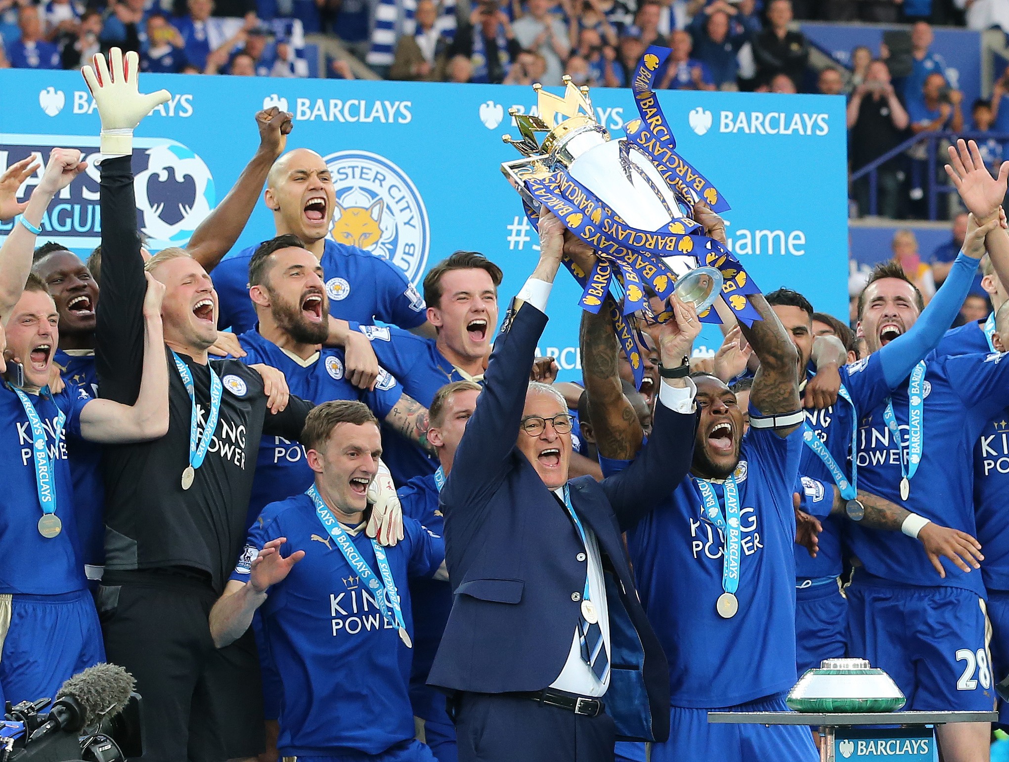 2016年5月7日,提前夺冠的莱斯特城在王权球场3-1击败埃弗顿,拉涅利与队长摩根共同举起了英超奖杯!莱斯特城创造了一段震惊世界的蓝狐童话,建队132年首次赢得顶级联赛冠军!