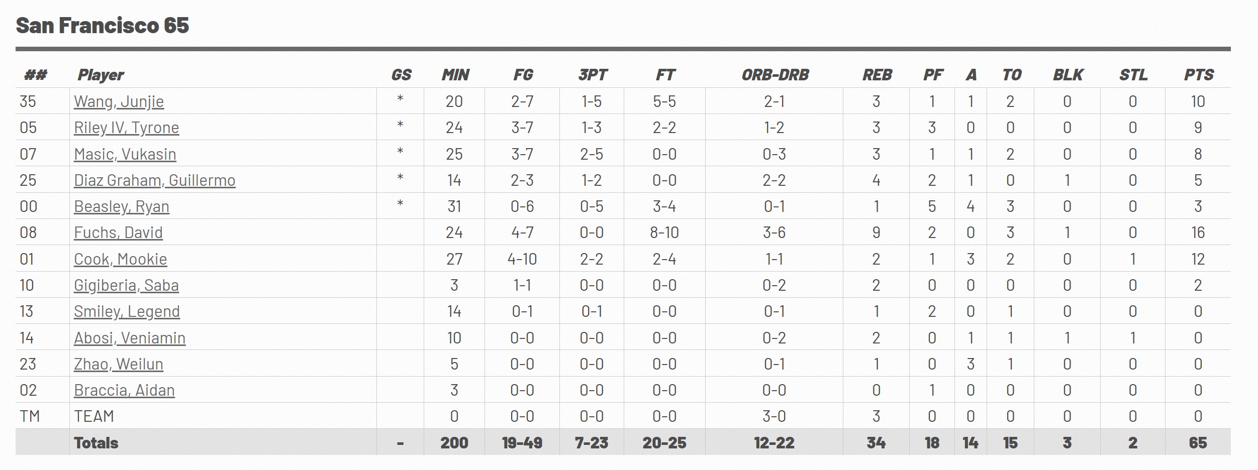 北京时间11月29日,NCAA常规赛,旧金山大学65-81不敌内华达大学。