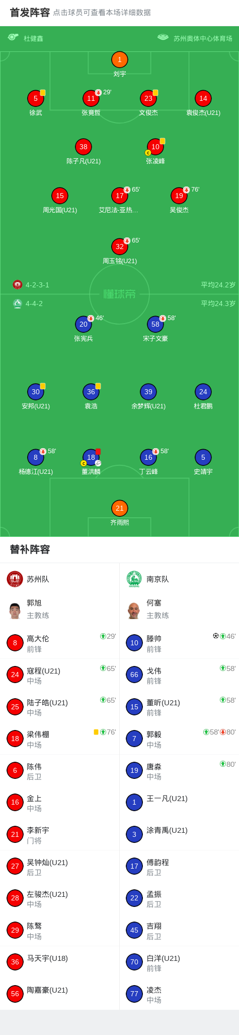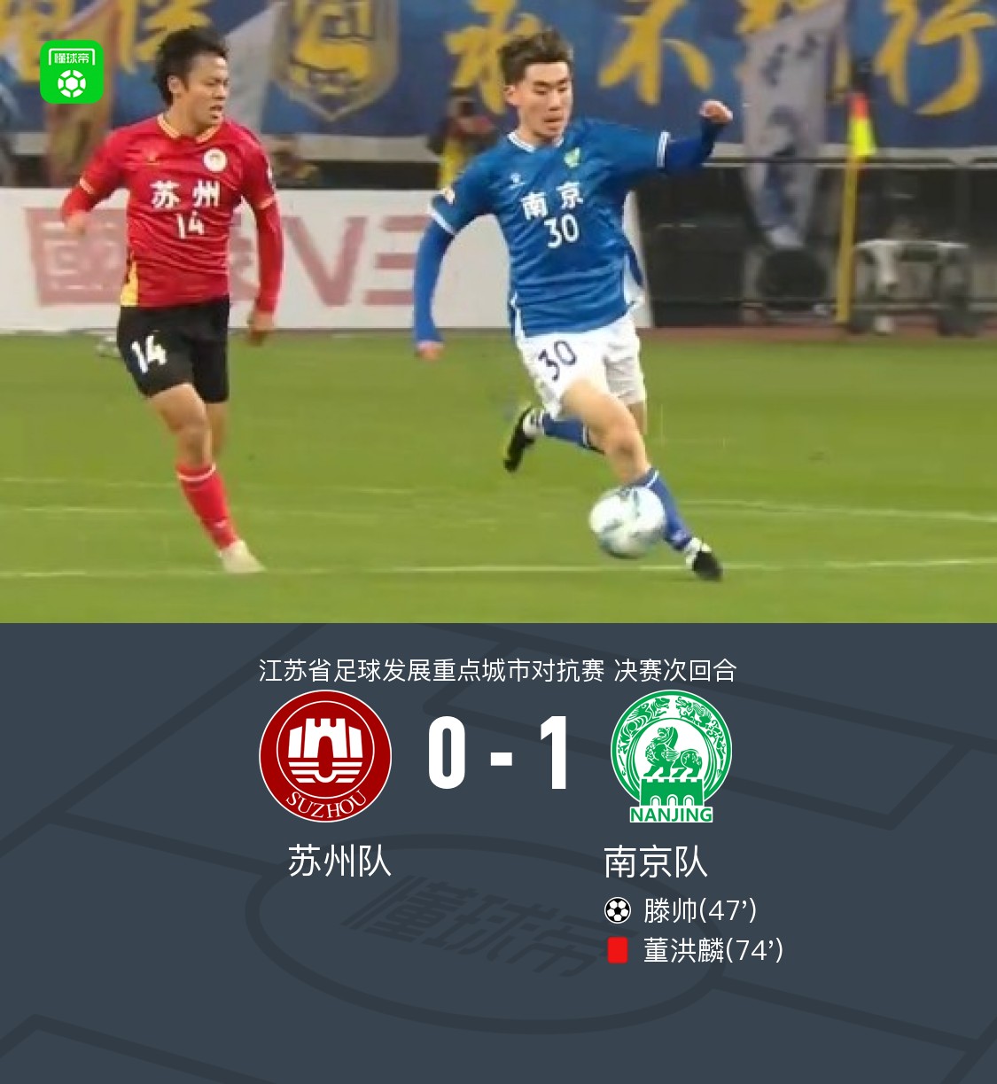 北京时间11月29日江苏省足球发展重点城市对抗赛 决赛次回合,苏州队对阵南京队。下半场滕帅禁区前劲射破门,之后双方球员发生冲突,裁判回看后向董洪麟出示红牌。最终苏州队0-1南京队,两回合3-1夺冠。