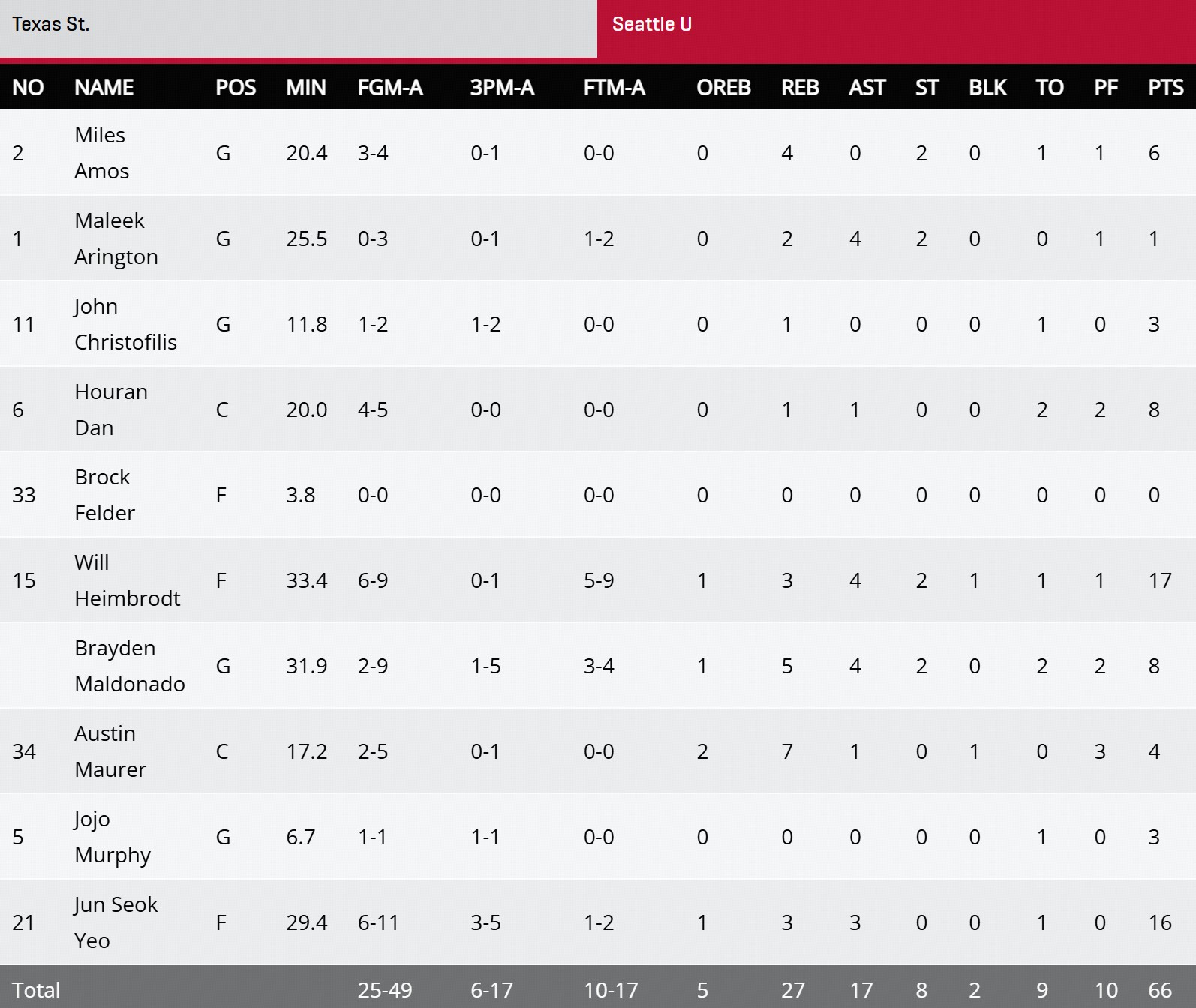 北京时间11月29日,NCAA常规赛,西雅图大学66-52轻取德州州立大学。