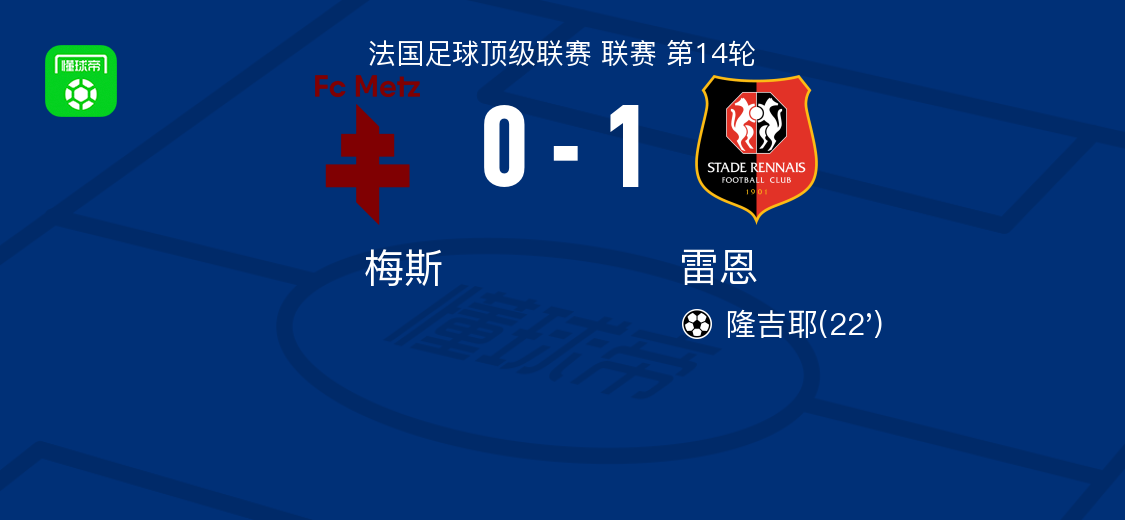 北京时间11月29日法国足球顶级联赛 联赛 第14轮,梅斯主场对阵雷恩。雷恩隆吉耶破门。最终比分梅斯 0–1 雷恩。 点击查看本场比赛详细数据>> 点击查看法甲完整积分榜>> 精彩瞬间 第22分钟,雷恩球员恩博洛助攻隆吉耶打入一球。 球队阵容 技术统计 文章导航 门兴0-0莱比锡,奥诺拉破门被吹,劳姆中框,门兴全场0射正 科莫2-0萨索洛连续12场不败,莫雷诺破门,尼科-帕斯献助攻