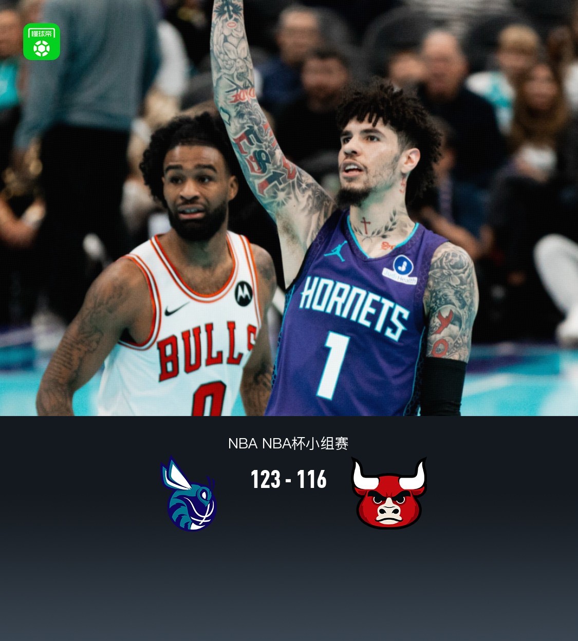 北京时间11月29日NBA NBA杯小组赛,夏洛特黄蜂对阵芝加哥公牛。半场黄蜂67-62公牛,最终黄蜂123-116公牛。夏洛特黄蜂布兰登-米勒27分5板1助,迈尔斯-布里奇斯22分8板7助;芝加哥公牛科比-怀特25分2板4助,约什-吉迪25分11板9助。