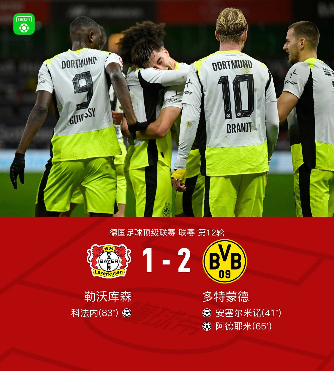 北京时间11月30日1:30,德甲第12轮继续进行,勒沃库森坐镇拜耳竞技场迎战多特蒙德,本场主裁判为托比亚斯-韦尔茨。上半场,安塞尔米诺力压防守头槌破门。下半场,法比奥-席尔瓦助攻阿德耶米头球建功,科法内为勒沃库森扳回一城。最终,多特2-1客胜勒沃库森。