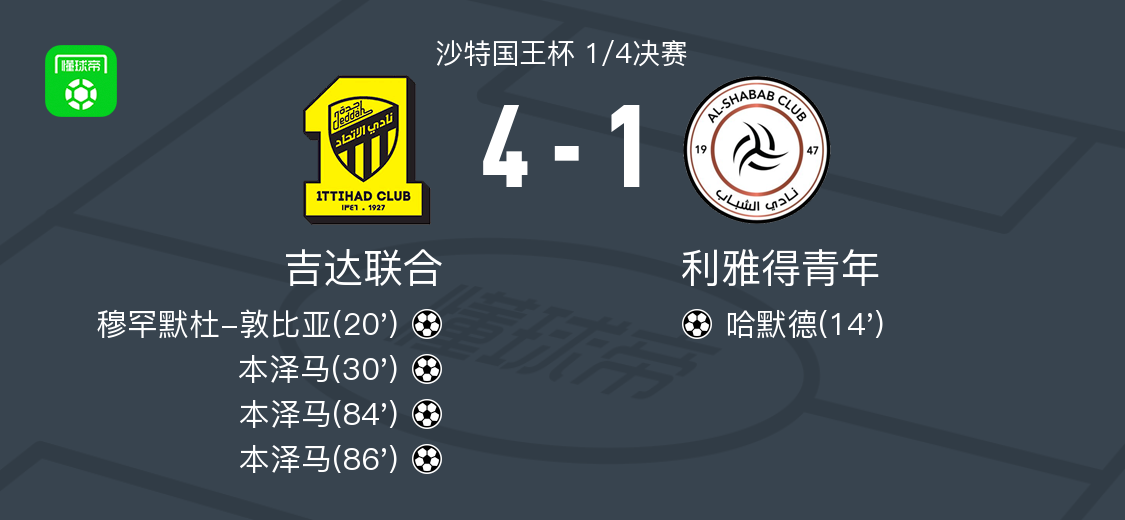 北京时间11月30日沙特国王杯 1/4决赛,吉达联合对阵利雅得青年。吉达联合穆罕默杜-敦比亚破门,本泽马帽子戏法。利雅得青年哈默德破门。最终比分吉达联合 4–1 利雅得青年。