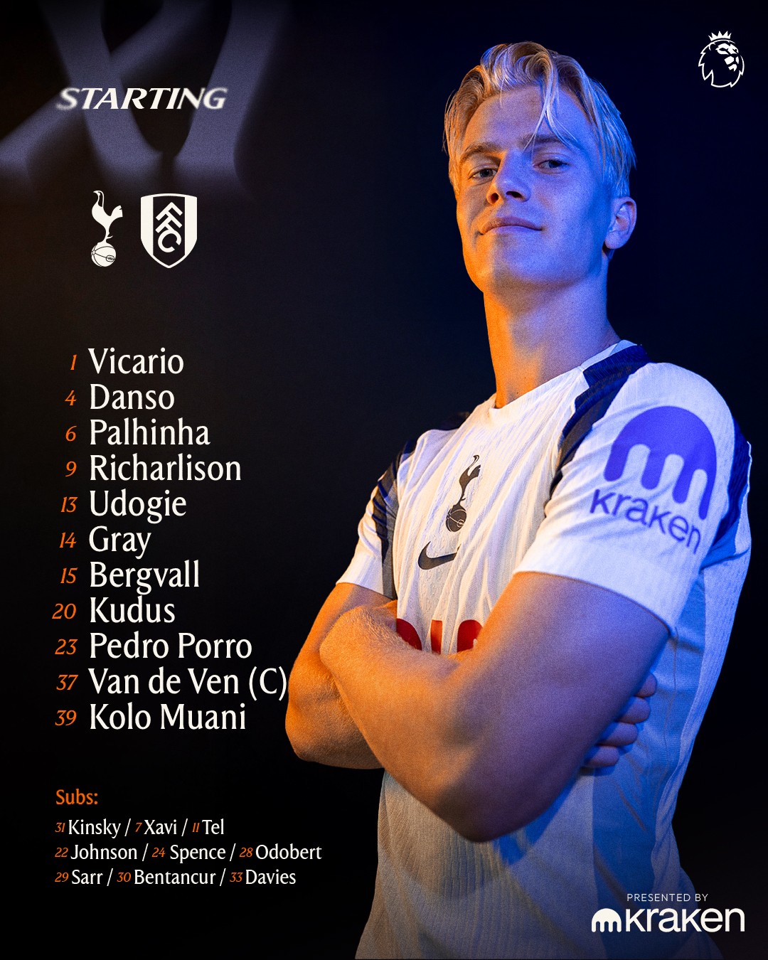 热刺vs富勒姆:里沙利松、穆阿尼首发,库杜斯、范德芬出战