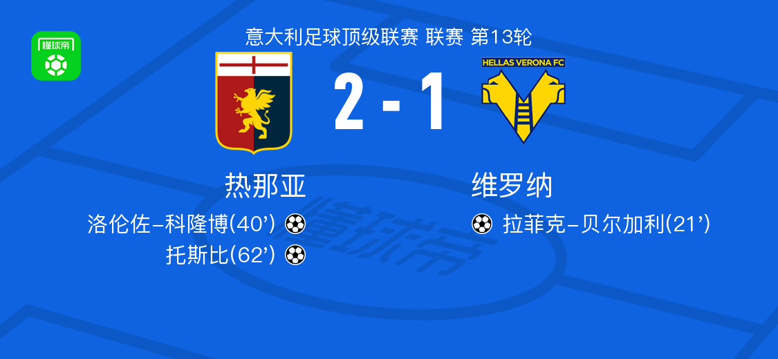 北京时间11月29日,意大利足球顶级联赛第13轮,热那亚坐镇主场迎战维罗纳。比赛中,维罗纳率先打破僵局,拉菲克-贝尔加利攻入一球。随后,热那亚展开反击,洛伦佐-科隆博接维蒂尼亚的助攻将比分扳平。进入下半场,热那亚继续推进攻势,托斯比在埃勒特松的助攻下完成破门,帮助球队实现反超。最终,热那亚以2比1战胜维罗纳。