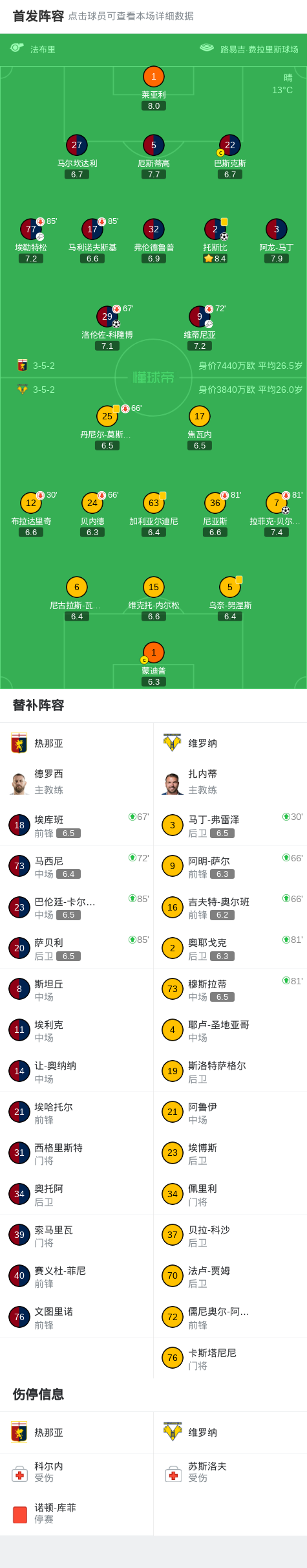 第40分钟,热那亚球员维蒂尼亚助攻洛伦佐-科隆博打入一球。