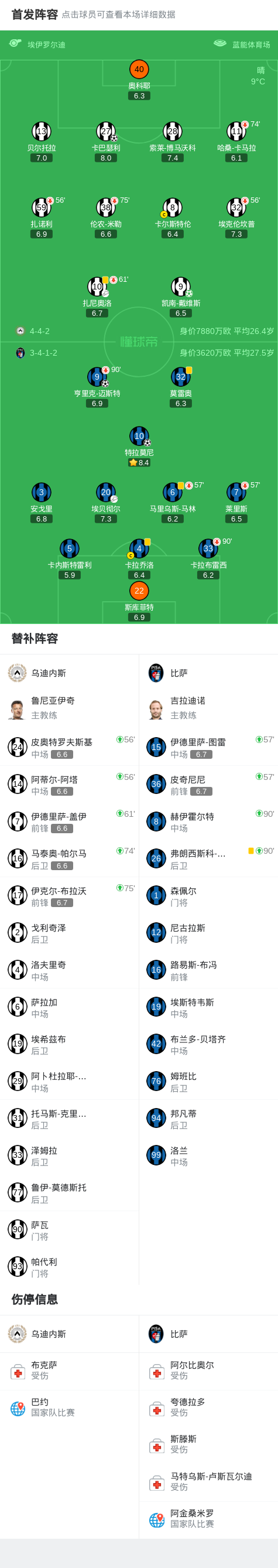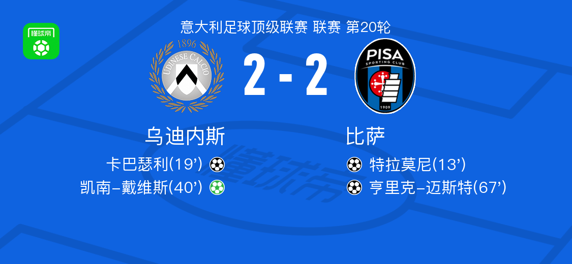 北京时间1月10日意大利足球顶级联赛 联赛 第20轮,乌迪内斯主场对阵比萨。乌迪内斯卡巴瑟利破门,凯南-戴维斯破门。比萨特拉莫尼破门,亨里克-迈斯特破门。最终比分乌迪内斯 2–2 比萨。
