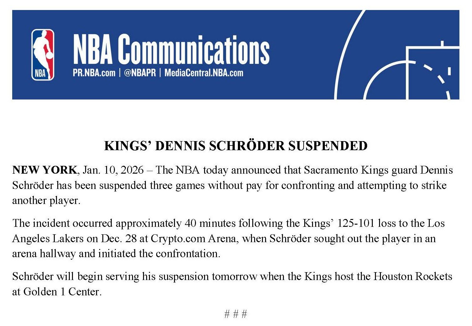 北京时间1月11日,NBA官方发布公告,国王球员施罗德被禁赛3场。 官方公告显示,施罗德在12月29日国王和湖人的比赛结束约40分钟后,在湖人主场球馆的走廊主动找到一名湖人球员并发生了冲突。 在比赛中,施罗德和东契奇在场上曾发生口角。 文章导航 加斯佩里尼:不想谈论拉斯帕多里的转会,这只会助长媒体炒作 罗塞尼尔:踢阿森纳是场硬仗,两天前就开始研究他们比赛录像