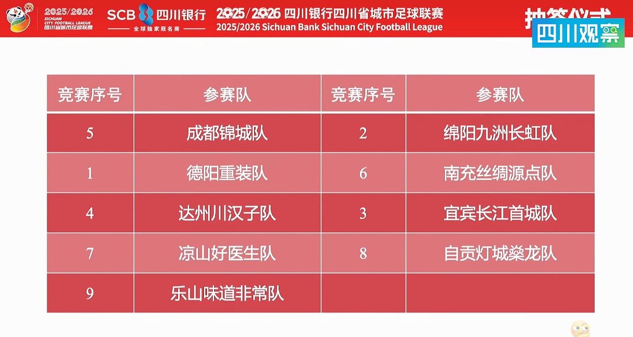 抽签结果显示,首轮对阵中,绵阳九洲长虹队对阵乐山味道非常队;自贡灯城燊龙队对阵宜宾长江首城队;达州川汉子队对阵凉山好医生队;南充丝绸源点队对阵成都锦城队;德阳重装队轮空。