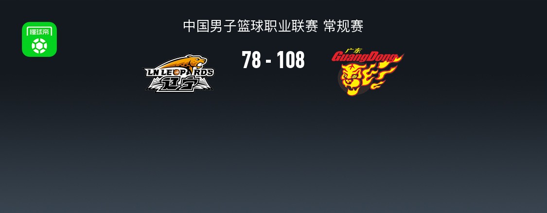 第四节辽宁李虎翼拿下8分,广东徐杰拿下6分,最终辽宁78-108不敌广东