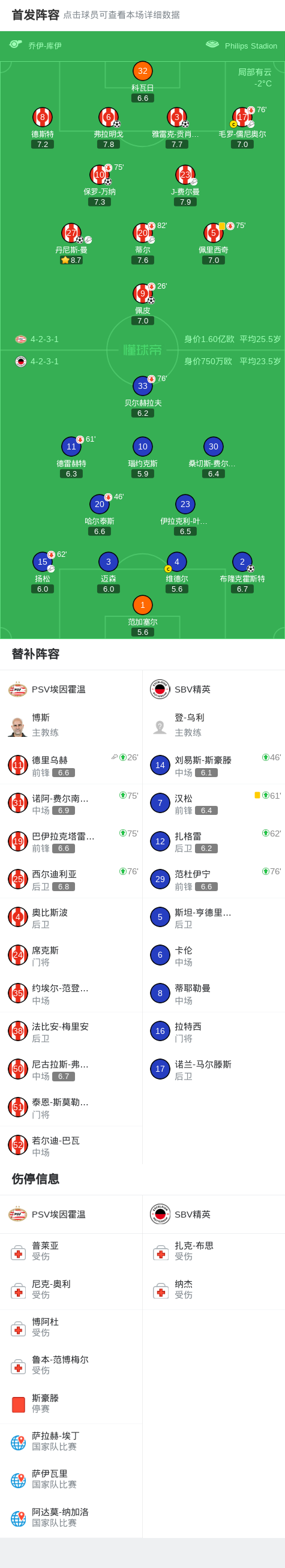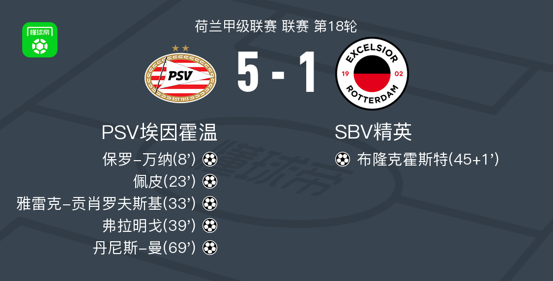 北京时间1月11日,荷兰甲级联赛第18轮,PSV埃因霍温主场迎战SBV精英。比赛开始后,丹尼斯-曼送出助攻,保罗-万纳为PSV埃因霍温首开纪录。随后蒂尔传威胁球,佩皮接球破门,将比分扩大。毛罗-儒尼奥尔随后贡献助攻,雅雷克-贡肖罗夫斯基冷静施射再下一城。J-费尔曼紧接着也完成助攻,弗拉明戈抓住机会建功,PSV埃因霍温上半场便取得四球领先。补时阶段,扬松助攻布隆克霍斯特为SBV精英扳回一球。易边再战,德里乌赫送出精准传球,丹尼斯-曼破门得手,帮助球队锁定胜局。最终全场比分为PSV埃因霍温5-1 SBV精英。
