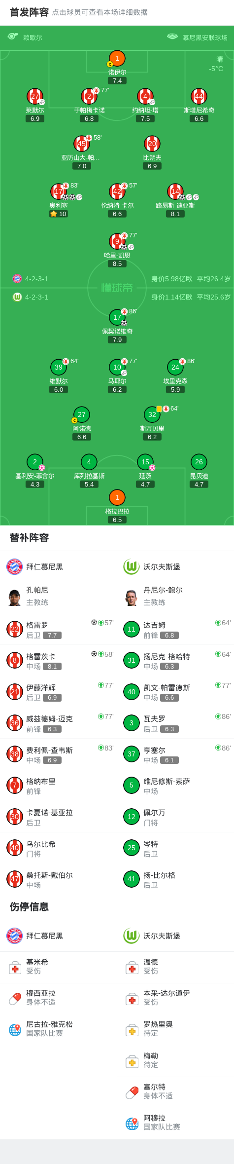 北京时间1月12日德国足球顶级联赛 联赛 第16轮,拜仁慕尼黑主场对阵沃尔夫斯堡。拜仁慕尼黑路易斯-迪亚斯破门,奥利塞梅开二度,格雷罗破门,哈里-凯恩破门,格雷茨卡破门。沃尔夫斯堡佩契诺维奇破门,基利安-菲舍尔,延茨自摆乌龙。最终比分拜仁 8–1 沃尔夫斯堡。