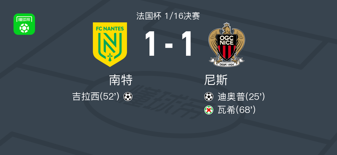 北京时间1月12日法国杯 1/16决赛,南特对阵尼斯。南特吉拉西破门。尼斯迪奥普破门。最终比分南特 11 尼斯。