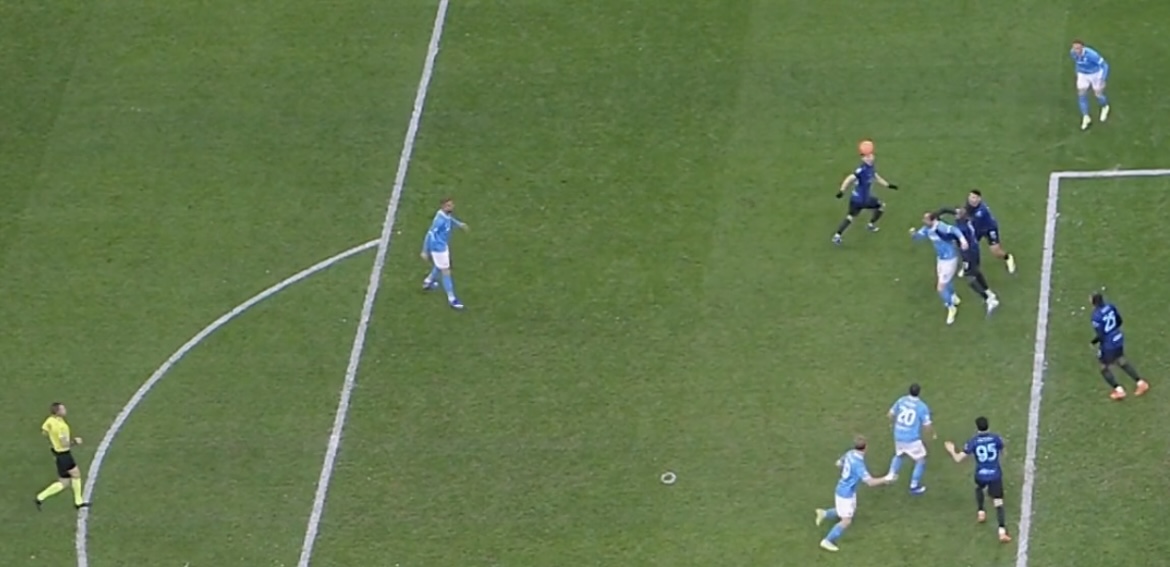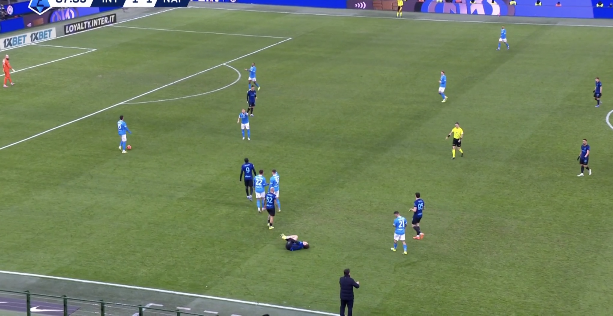随后在国米的一次前场压迫中,小胡安大脚开球后,并没有收脚,蹬在了图拉姆的胸部,连犯规都没算,黄牌也没有给,意甲裁判尺度现在都这么大了吗?