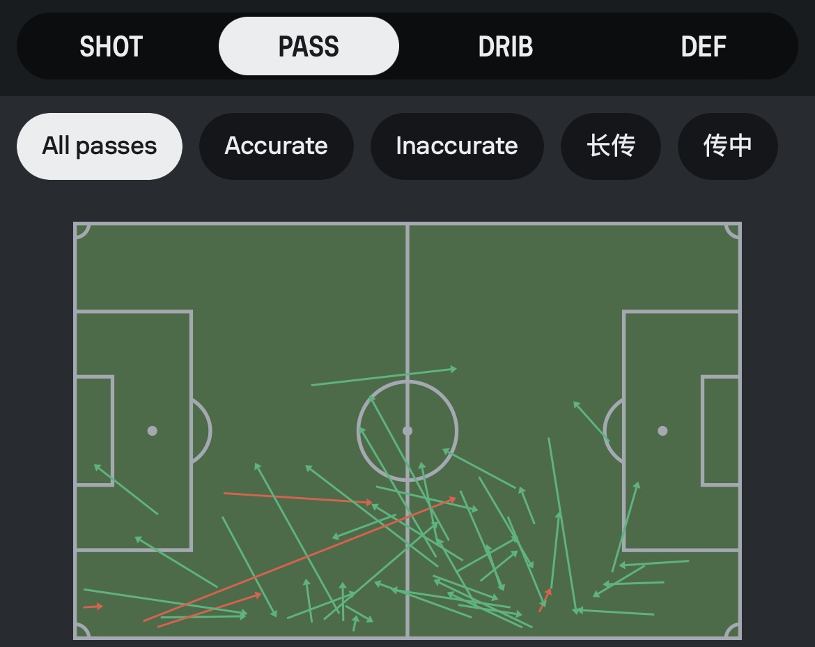 恩里克不像比塞克那般透明,起码还7次抢回球权,防守到位率是高,但再次证明了自己只是国米右翼位的替补,在数次1对1的情况下,不会过人,也没传中能力,不是横传就是回传,贻误战机。见下图: