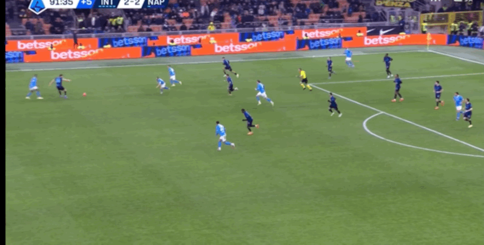 下半场50分钟后,因为上半时高强度的消耗,国米已无法提供高强度的压迫能力,经常是:没有加速跑,人是跑到了位置了,可是却无法给到对手压力,3条线之间空间过于大,无法形成断球,反而给了霍伊伦较多空间,他的冲刺和支点让阿坎吉疲于应付。