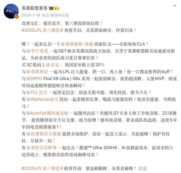 与去年第三赛段将比,LPL失去了梅赛德斯-奔驰、莫斯利安、OPPO、英特尔四大赞助商,总赞助商数量减少3家。
