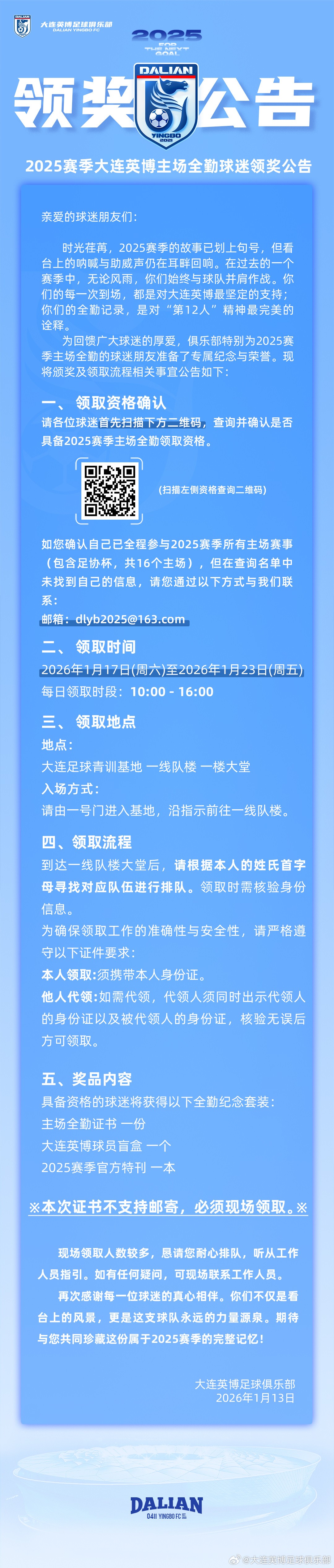 2025赛季大连英博主场全勤包括16场中超主场外加足协杯主场,俱乐部安排球迷在1月17日至1月23日在大连足球青训基地一线队楼一楼大堂领取全勤纪念套装。