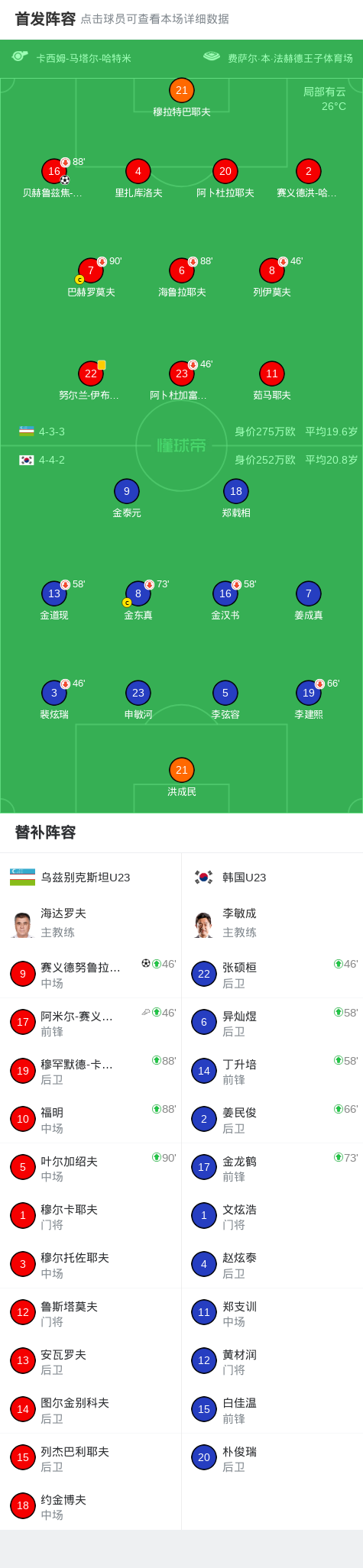 北京时间1月13日,U23亚洲杯小组赛第3轮展开较量,乌兹别克斯坦U23迎战韩国U23。比赛中,贝赫鲁兹焦-卡里莫夫率先为乌兹别克斯坦U23取得进球,随后阿米尔-赛义多夫送出助攻,赛义德努鲁拉耶夫接应破门,进一步扩大领先优势。最终,乌兹别克斯坦U23以2-0战胜对手,全取三分,两队一同出线。