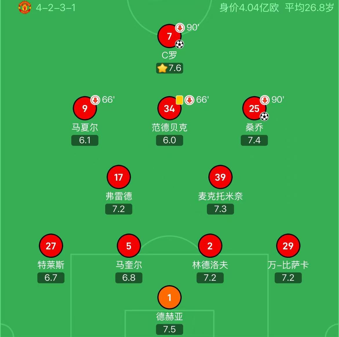 卡里克首段任期的最后一场比赛是2021/2022赛季英超第14轮主场迎战阿森纳。那场比赛,卡里克排出了4-2-3-1的阵型。首发门将是德赫亚,四名后卫分别是特莱斯、马奎尔、林德洛夫、达洛特,中场弗雷德、麦克托米奈、B费,拉什福德和桑乔分居两翼,单前锋是C罗。那场比赛,C罗双响,B费破门,曼联主场3-2战胜阿森纳。