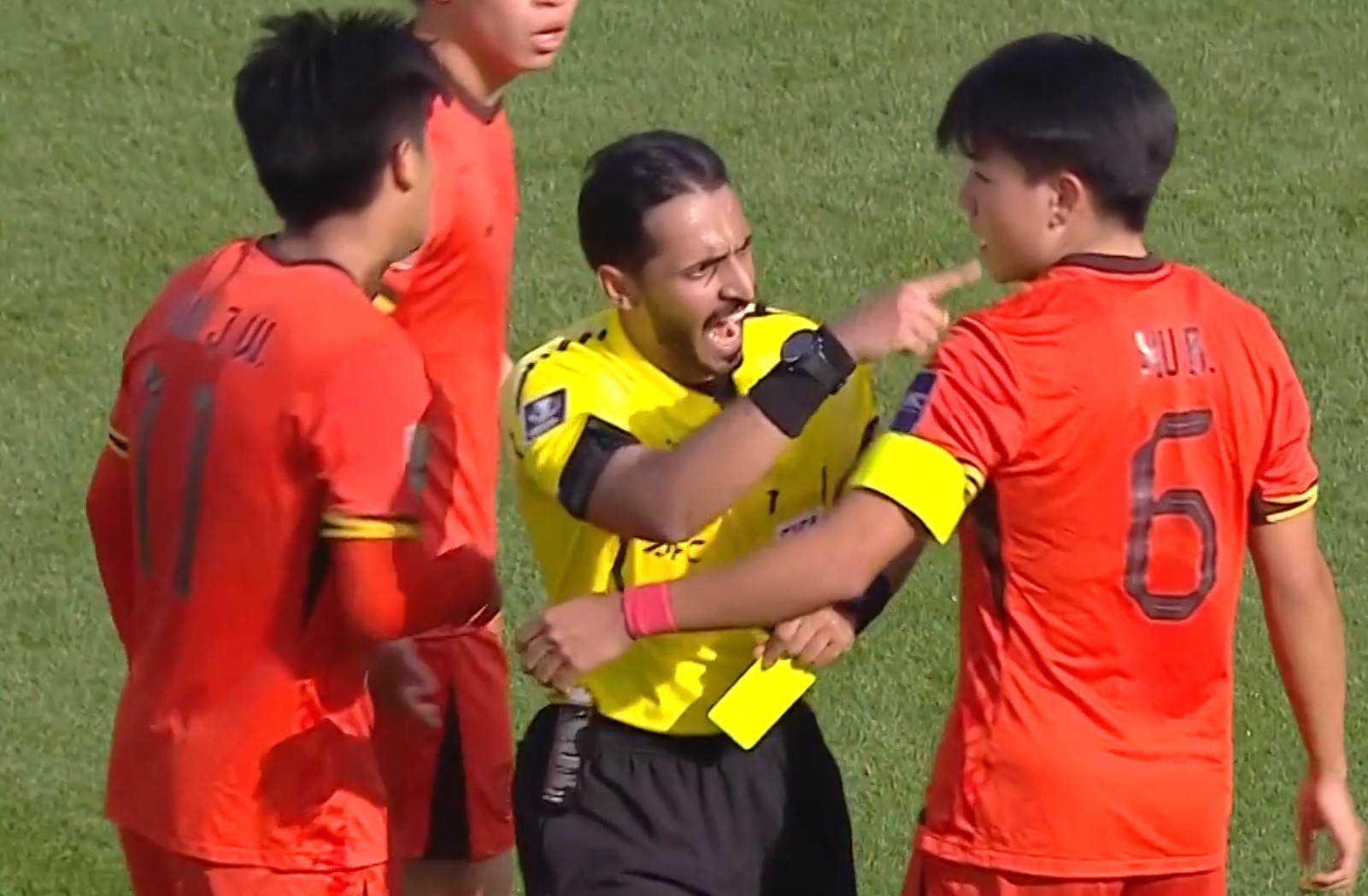第29分钟,胡荷韬被吹犯规后不满尝试踢球,吃到黄牌。