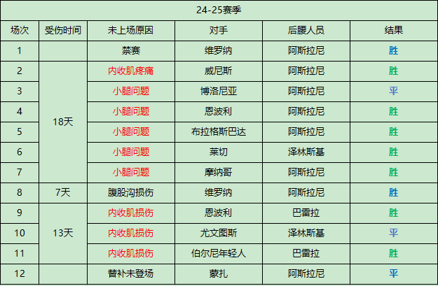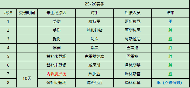 我翻了下近2年的战绩,恰尔汗奥卢缺阵了20场比赛,先后共使用过阿斯拉尼、巴雷拉、泽林斯基来顶替,国际米兰取得了15胜5平的不败战绩,从总体上来看,影响倒也不大,见下图: