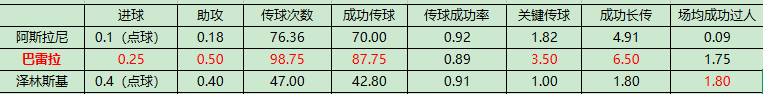 巴雷拉在进攻侧的总体表现遥遥领先另2位,传球成功率稍低是因为关键传球很多。进球第1、助攻第1、关键传球第1、成功长传第1、场均成功过人第2.