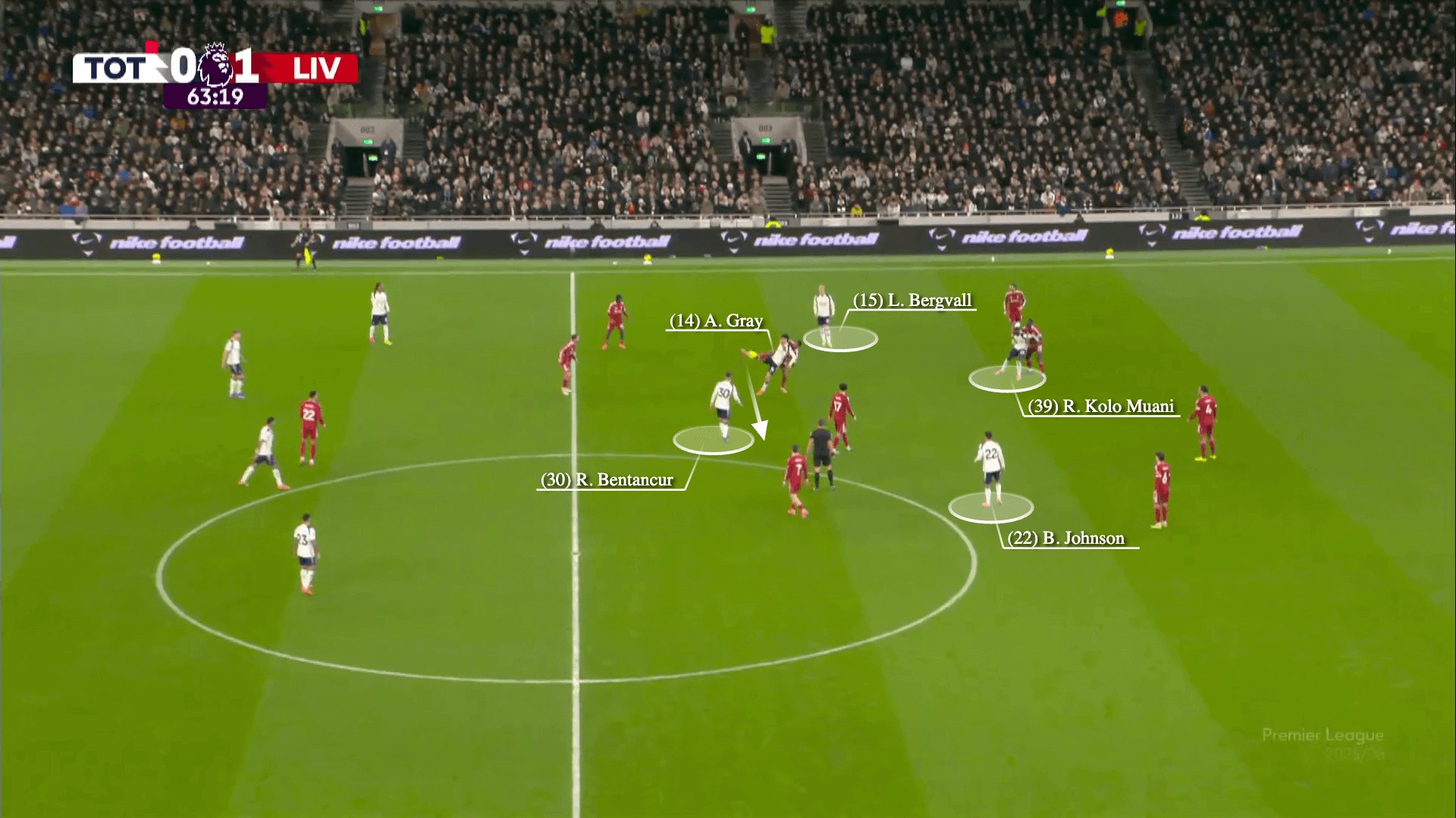 以下示例来自121-2负于利物浦的比赛,展示了这种进攻组织模式的一次成功运用。门将维卡里奥长传至中场,阿奇格雷将球点给罗德里戈本坦库尔。穆阿尼牵制住科纳特,而布伦南约翰逊和卢卡斯贝里瓦尔的站位阻止了利物浦后卫的上抢。