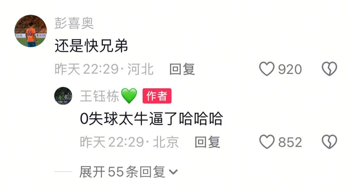 彭啸评论道:“还是快兄弟”,王钰栋回复:“0失球太牛X了哈哈哈”