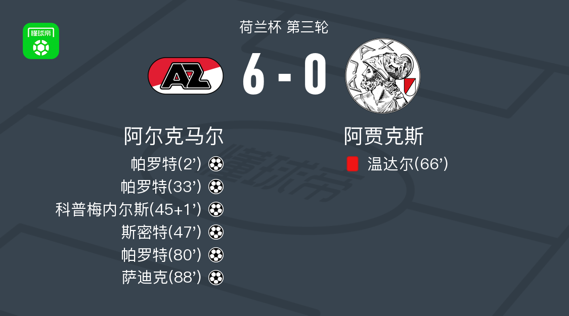 北京时间1月15日,荷兰杯第三轮展开较量,阿尔克马尔迎战阿贾克斯。比赛伊始,帕罗特迅速为阿尔克马尔取得领先。随后奥乌苏-奥杜罗送出助攻,帕罗特再下一城。上半场补时阶段,德威特助攻科普梅内尔斯破门,进一步扩大优势。易边再战仅片刻,斯密特接队友配合后攻入一球,比分继续拉开。第66分钟,阿贾克斯球员温达尔被红牌罚下。比赛末段,帕罗特完成个人第三粒进球,随后又助攻萨迪克建功。最终全场比赛结束,阿尔克马尔以6比0战胜对手。