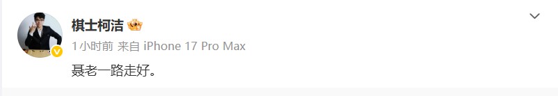 今日,柯洁更新个人社媒悼念聂老:“聂老一路走好。”