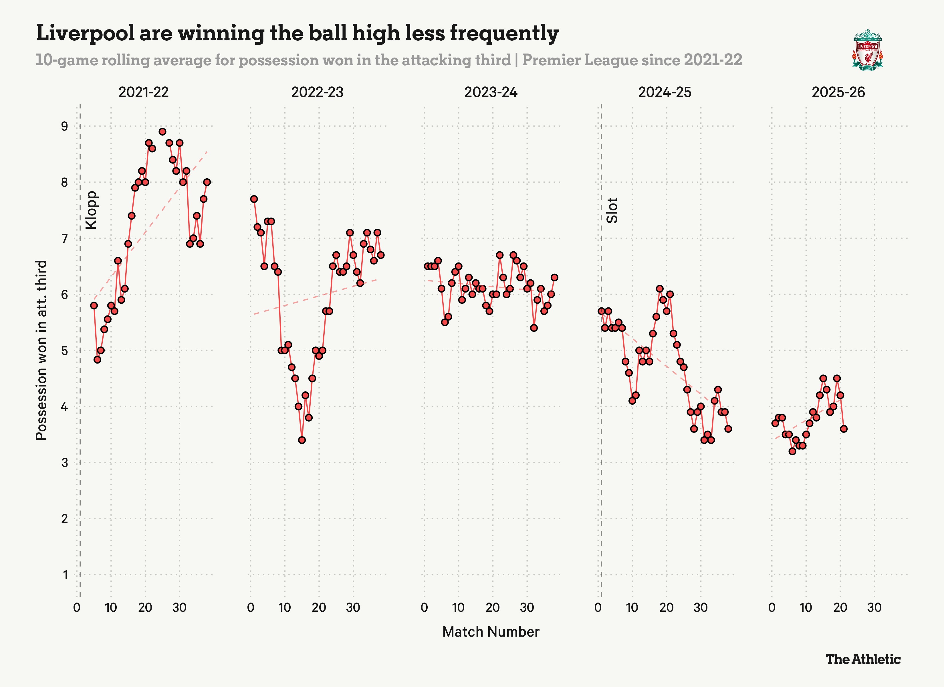 尽管如此,利物浦在无球状态下高位逼抢的倾向明显下降,如下方10场比赛的滚动平均值所示,他们在进攻三区夺回球权的次数有所减少。本赛季,利物浦平均每90分钟高位夺回球权3.7次,远低于过去7个赛季的水平。