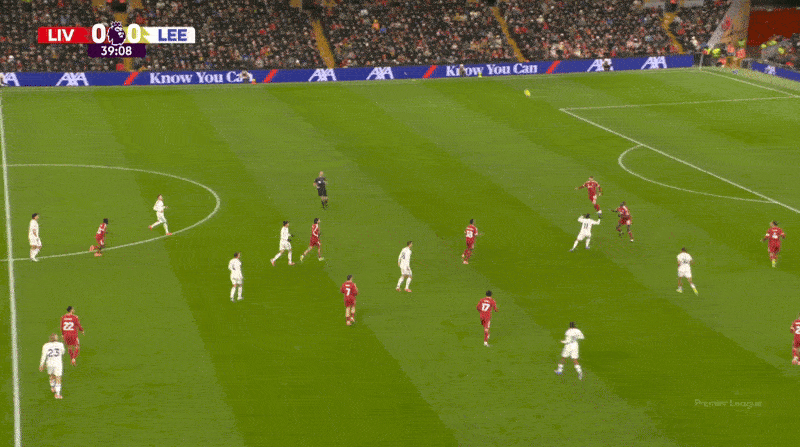 但利兹联凭借人群控制住了第二(或第三)落点,他们仅用一个简单的动作,就毫不费力地推进到了利物浦的防守三区。