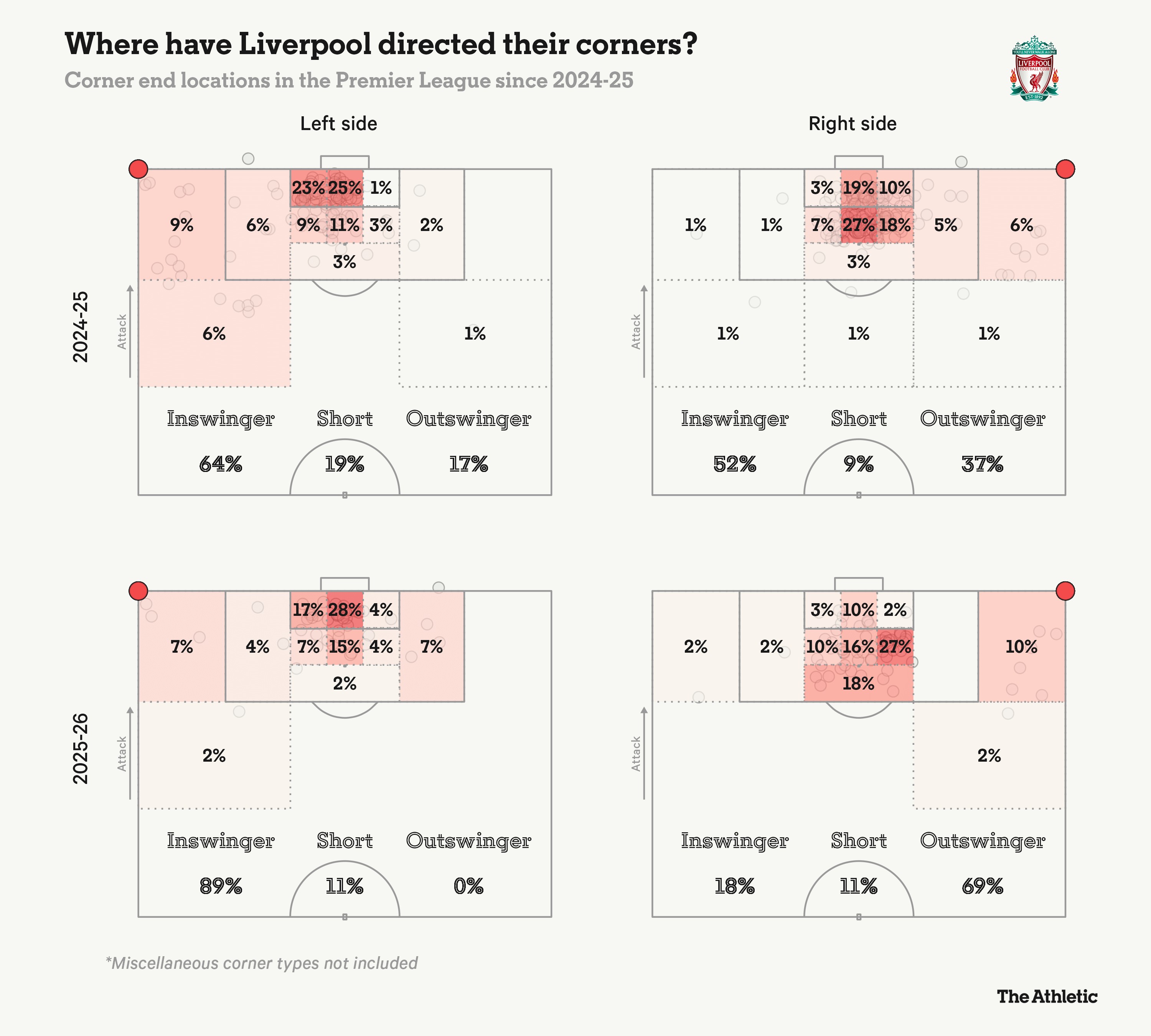 自上赛季以来利物浦进攻角球落点分布