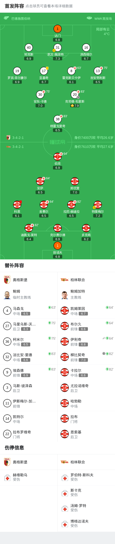北京时间1月16日德国足球顶级联赛 联赛 第17轮,奥格斯堡主场对阵柏林联合。奥格斯堡克劳德-毛里斯破门。柏林联合柳比契奇破门。最终比分奥格斯堡 1–1 柏林联合。