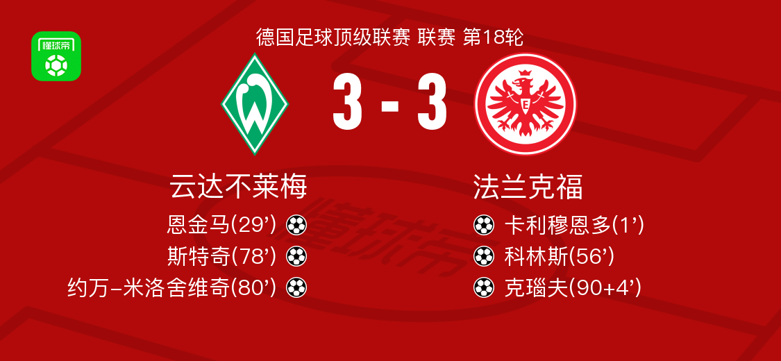 北京时间1月17日,德国足球甲级联赛第18轮展开较量,云达不莱梅坐镇主场迎战法兰克福。比赛伊始,法兰克福迅速取得领先,卡利穆恩多接纳撒尼尔-布朗助攻后破门得分。随后云达不莱梅展开反击,菅原由势送出精准传球,帮助恩金马将球送入对方球门,扳平比分。