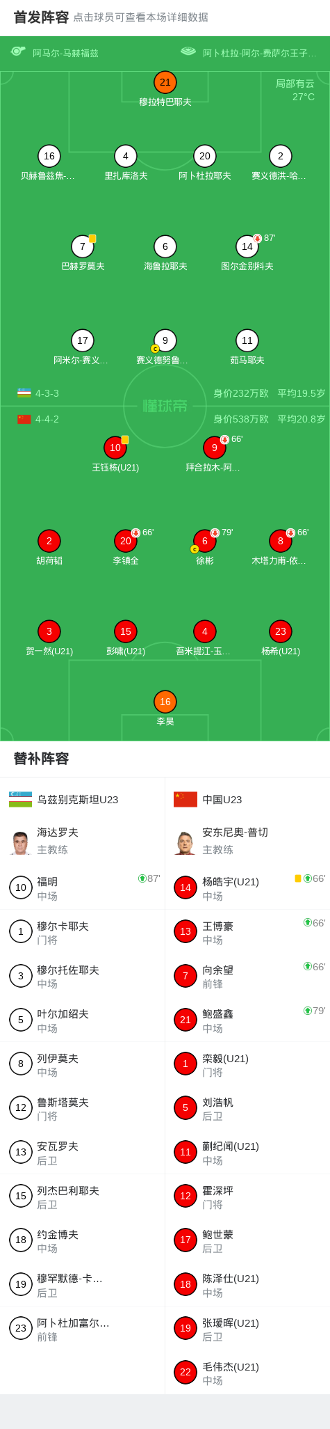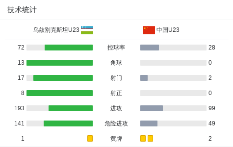 北京时间1月17日U23亚洲杯 1/4决赛,乌兹别克斯坦U23对阵中国U23。最终比分乌兹别克斯坦U23 0–0 中国U23。