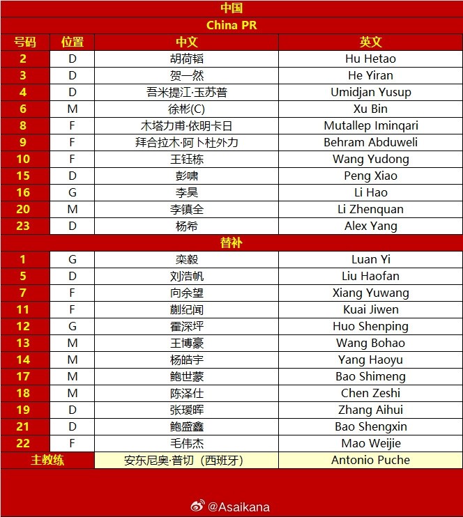 U23国足首发:16-李昊、2-胡荷韬、23-杨希、15-彭啸、4-吾米提江-玉苏普、3-贺一然、6-徐彬、20-李镇全、8-木塔力甫、9-拜合拉木、10-王钰栋