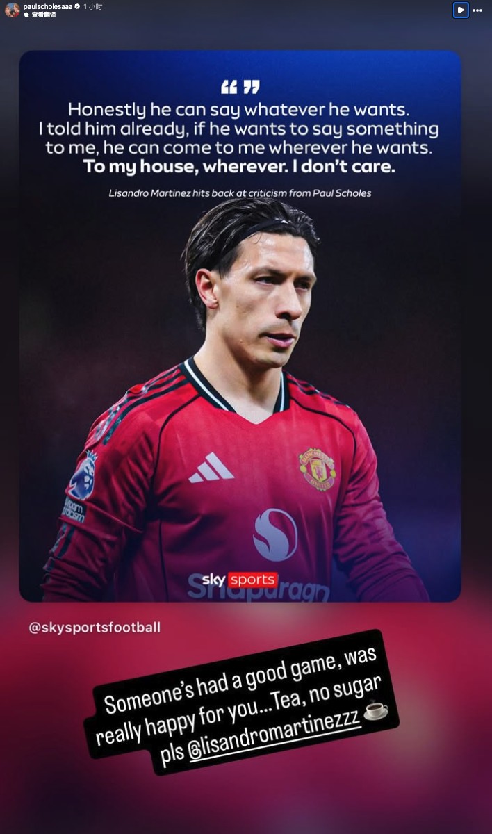 斯科尔斯在社交媒体转载了利桑德罗-马丁内斯在曼市德比后的采访,并写道:“有人踢了一场好球,真的为你感到高兴……来杯茶,不加糖,谢谢☕️”