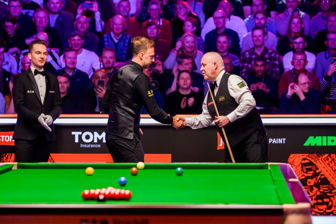 希金斯与特鲁姆普的比赛率先进行,特鲁姆普开局状态甚好连胜三局,随后希金斯扳回两局并在第五局中打出单杆104分,此后双方各胜一局,第八局特鲁姆普在希金斯率先打出单杆62分的情况下完成逆转并率先拿到赛点,第九局末段双方先后出现进攻失误,最终希金斯抓住机会再扳一局,第十局希金斯再胜一局将比赛拖入决胜局,决胜局希金斯打出单杆57分获胜。希金斯也就此成为了历史上晋级三大赛决赛最年长的球员。