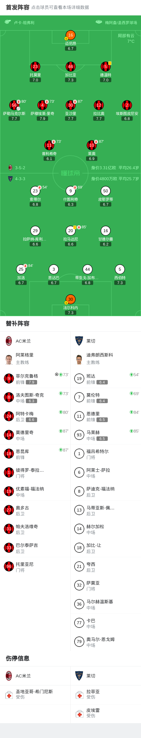 第76分钟,萨勒马克尔斯右路传中,菲尔克鲁格头球破门,米兰1-0莱切