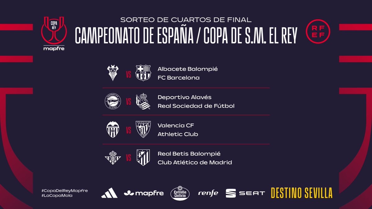 北京时间1月19日,2025-26赛季国王杯八强对阵抽签结果出炉,巴萨将客场对阵八强中唯一一支西乙球队阿尔瓦塞特,后者在1/8决赛中淘汰了皇马。