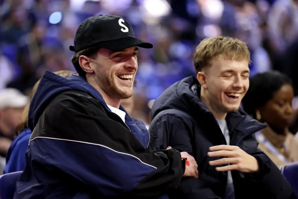 NBA伦敦赛当日下午在伦敦O2体育馆举行,奥兰多魔术对阵孟菲斯灰熊。刚在周六代表阿森纳出战的德克兰-赖斯来到现场观赛,坐在场边贵宾席,视角极佳。