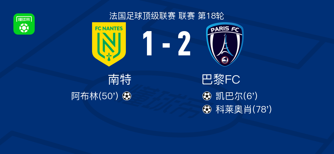 北京时间1月19日法国足球顶级联赛 联赛 第18轮,南特主场对阵巴黎FC。南特阿布林破门。巴黎FC凯巴尔破门,科莱奥肖破门。最终比分南特 1–2 巴黎FC。