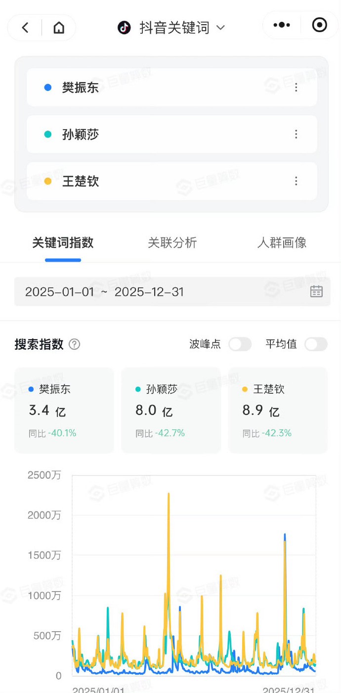 在抖音搜索中,“王楚钦”2025年的搜索次数高达8.9亿,相对比的是孙颖莎的8亿次以及樊振东的3.4亿次。