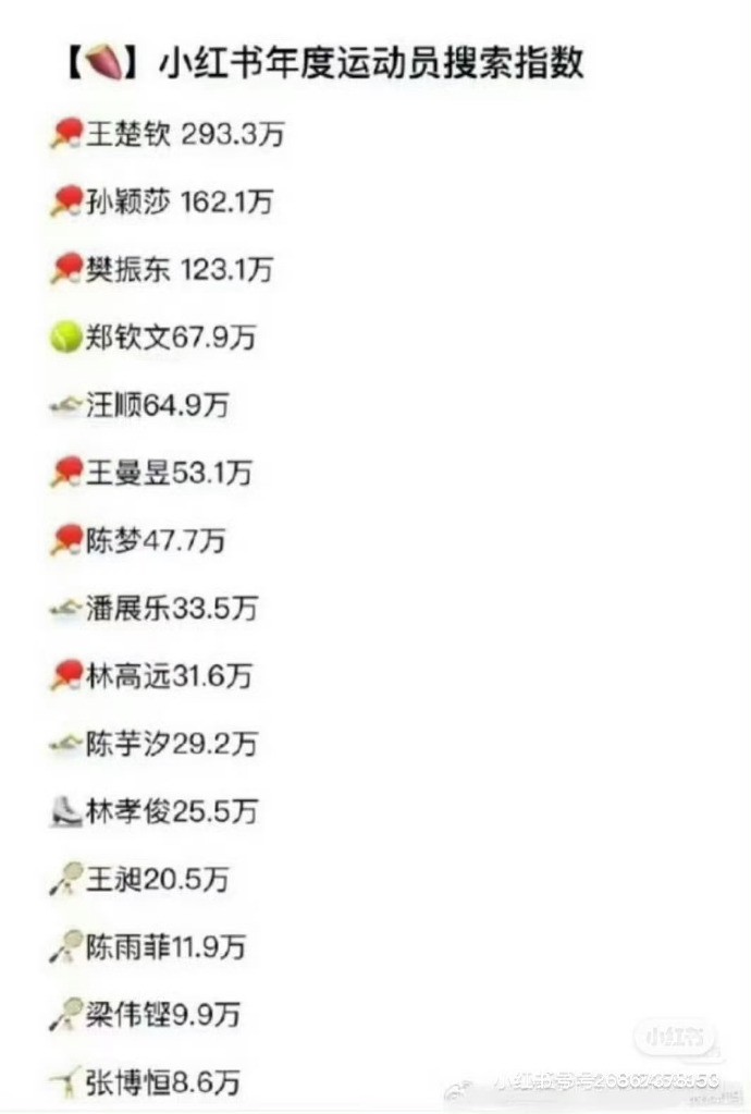 在小红书的搜索指数中,王楚钦以293.3万高居榜首,断崖领先第二名孙颖莎的162.1万。