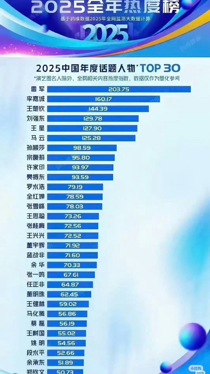 在2025年全年全网热度排行榜中,王楚钦仅次于雷军和李嘉诚,力压刘强东马云等人位列第三位。(此榜单排除了演艺圈名人)