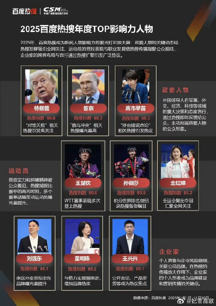 据博主“只喜欢好看的ggdd”整理,王楚钦2025年在多个平台的搜索榜单上高居前列,与许多文体政商人物齐名,甚至在全网热度指数上高于刘强东和马云。