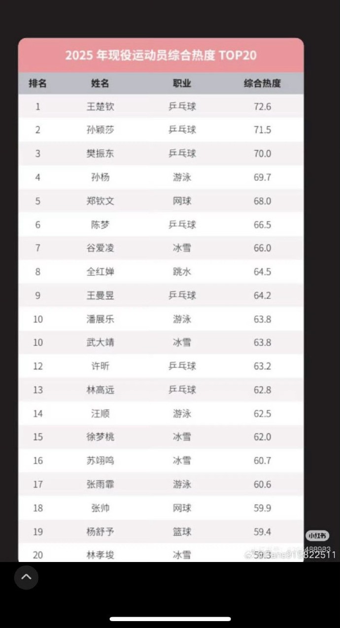 在现役运动员综合热度中,王楚钦再度以72.6分登顶,孙颖莎和樊振东分列二三名。